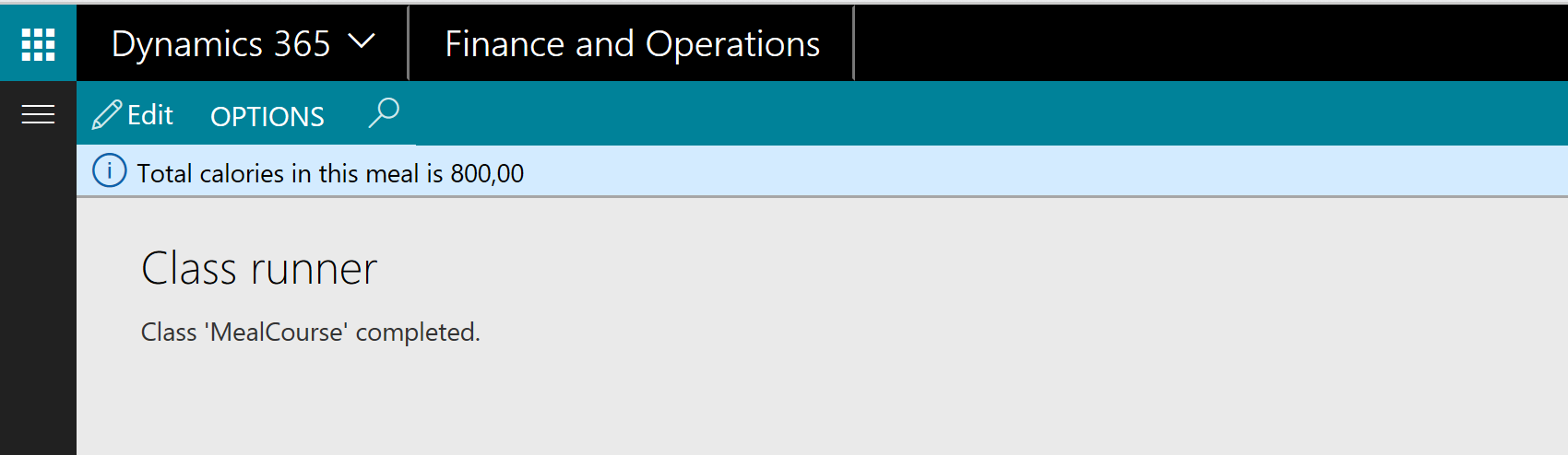 Dynamics 365 FO may return no records for a certain table, but it cannot return an NULL value for a field; in addition, I would like to spare the caller an if (! parameter) {return}; validation. This is why the caller is always given at least one object of the MainCourseNone type which returns a zero and does nothing. The API then reduces to a one-liner:… = MealParameters::find().meal().kcalTotal();