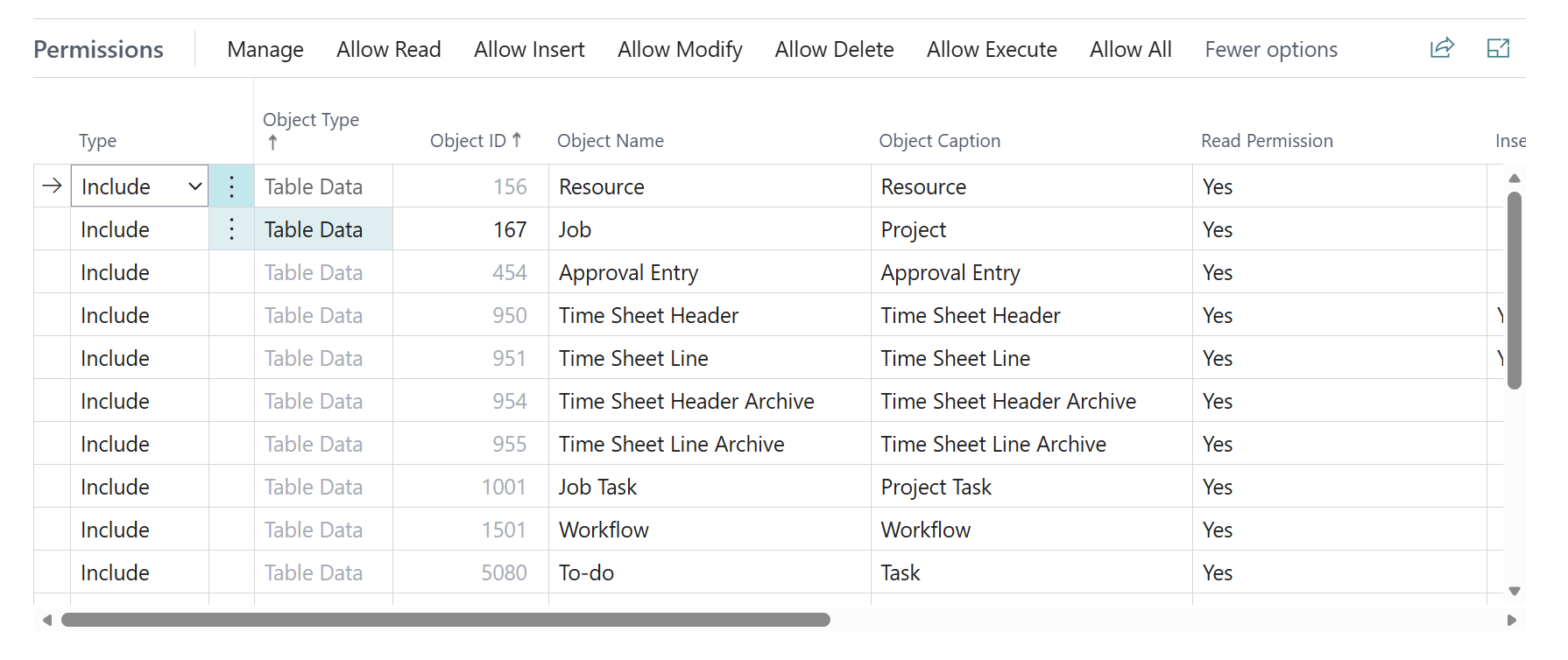 The permission set was built from scratch and only includes the required tables, these cover Time Sheet Header and Time Sheet Line, including archive tables, as well as supporting data such as Resources, Jobs, Job Tasks, Approval Entries, Workflow, cues and some others. These dependencies are necessary for the landing page to display correctly: