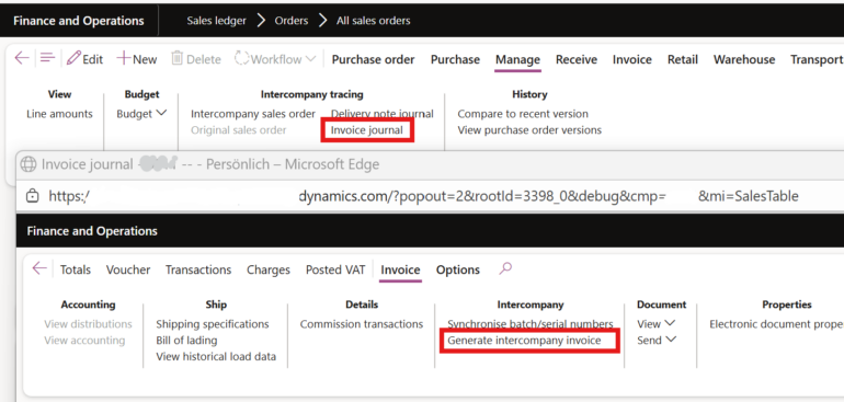 The standard process requires a user to actively navigate to the purchase order in the receiving company, click Intercompany tracing / Invoice journal (it switches the legal entities in the process), and manually trigger the “Generate intercompany invoice” function. Only after this step does the vendor invoice appear. The expectation is straightforward: once the sales invoice is posted, the corresponding intercompany vendor invoice should automatically be created in the receiving entity and appear there as a pending invoice, ready for review and approval. The system already contains all the necessary logic, but it simply does not execute it at the right moment.