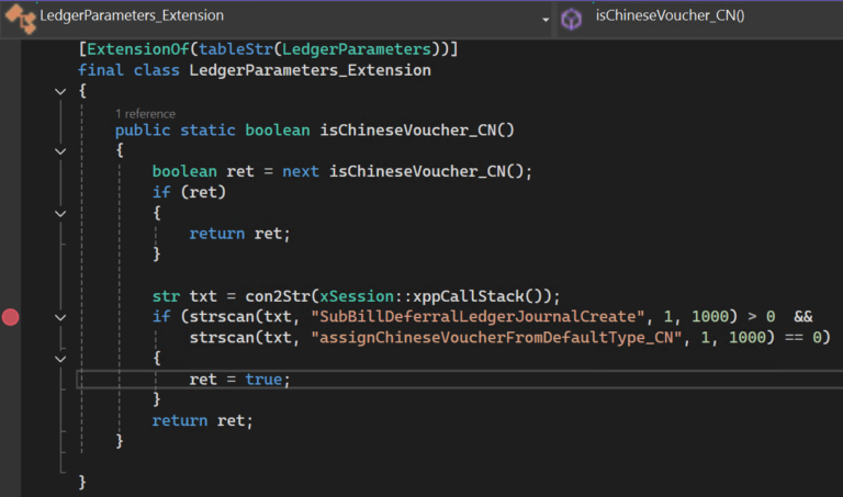 At last, these stored rates are used in the monthly revenue recognition (do not Summarise the journal lines!). This is the hardest part, because the class SubBillDeferralLedgerJournalCreate is nearly impossible to extend in the D365 FO standard, as the developers either “privatised” or “internalised” all methods for no obvious reason. All.. but one. I’ll leave this adventurous Chinese hack uncommented: