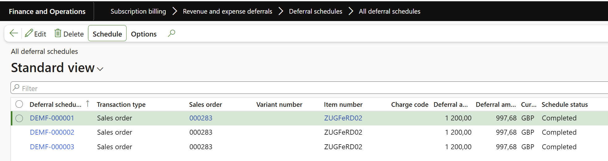 The form Subscription billing > Revenue and expense deferrals > Deferral schedules > All deferral schedules has been extended to reflect the new fields, too: