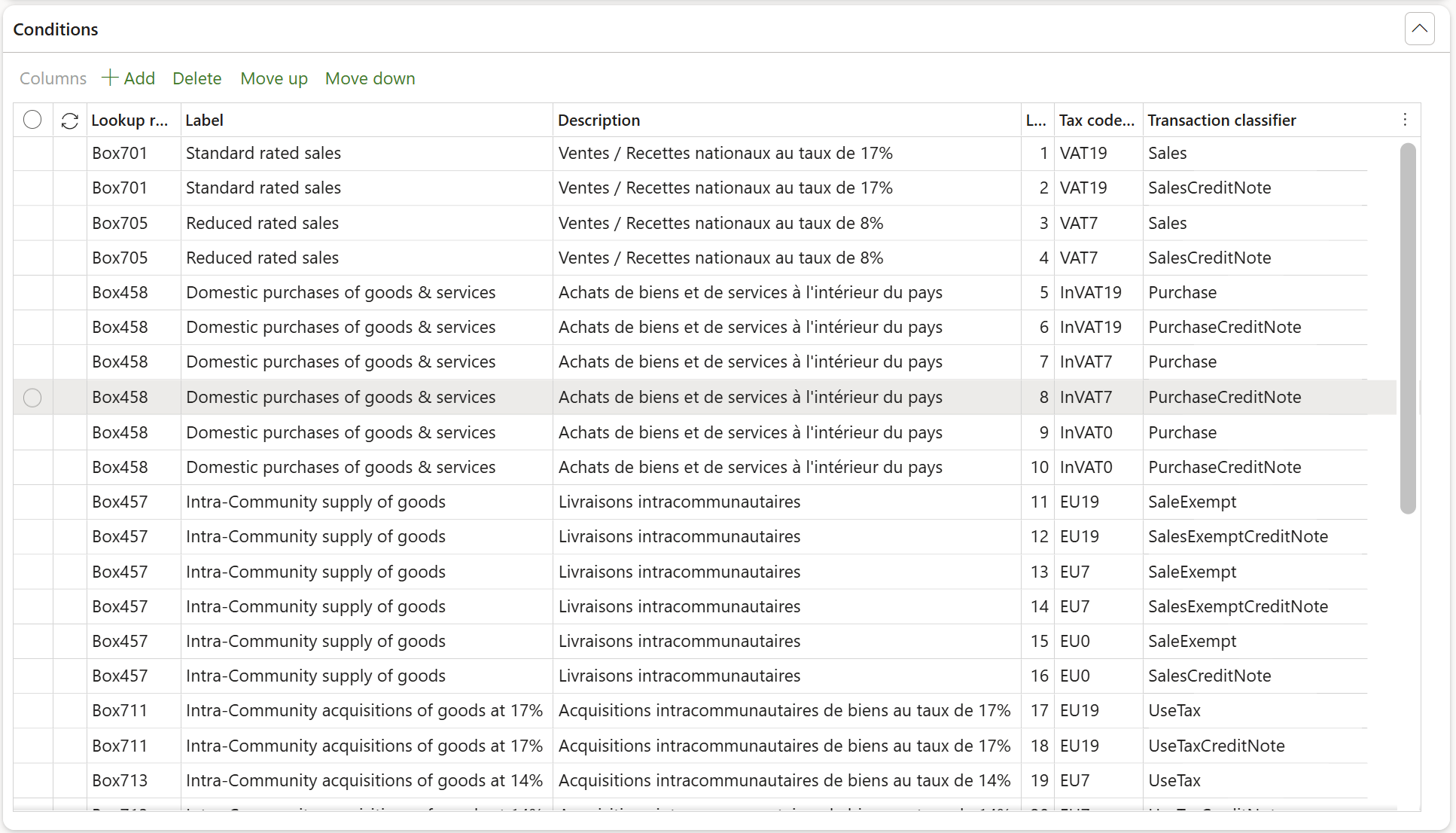 A tax code lookup, implemented exactly like in all other supported VAT declarations in Dynamics 365 for Finance, namely under the Application specific parameters of the ER format, is fully configurable and free of hard-coding: